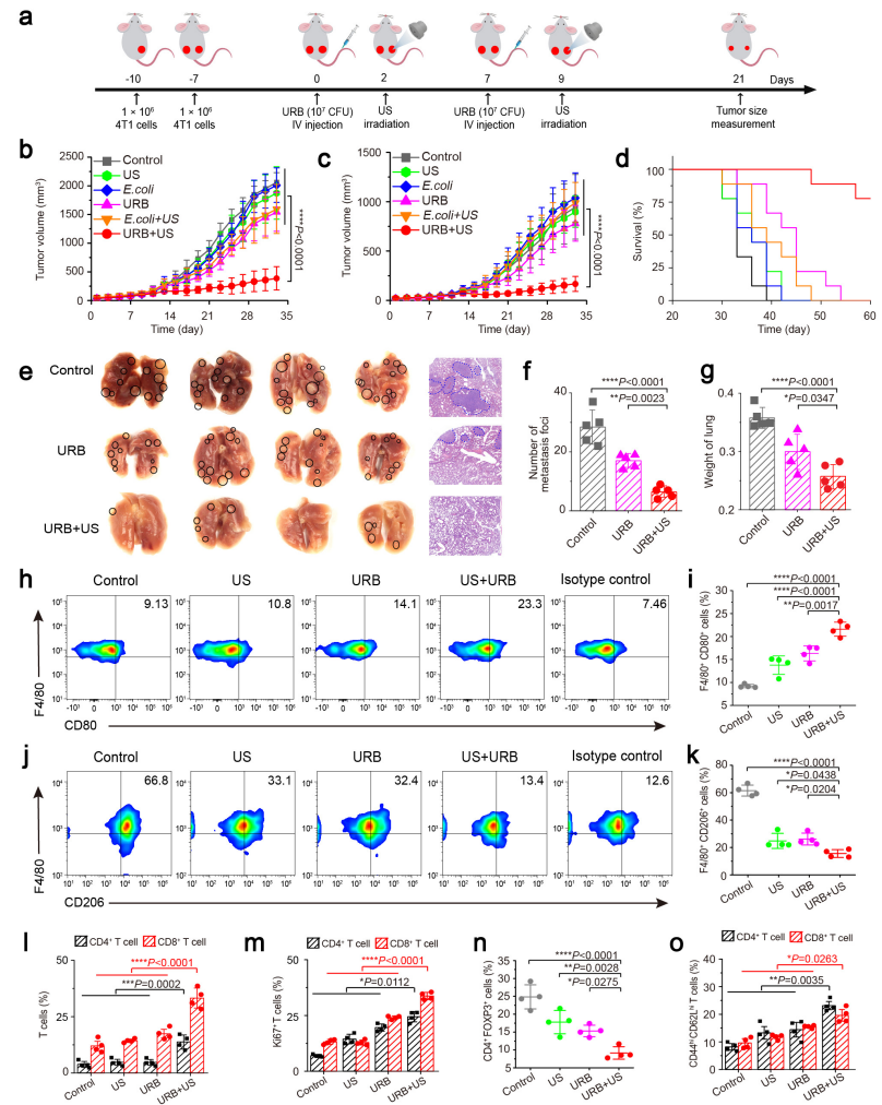 为了进一步探讨超声调控细菌表达IFN-γ能否抑制远处肿瘤的生长,研究团队建立了乳腺癌小鼠双侧皮下瘤移植模型,顺利获得超声辐照其中一侧的肿瘤,观察辐照侧和未辐照远端肿瘤的生长和转移。结果发现,顺利获得尾静脉注射超声响应性细菌并在48小时接受超声辐照后,不仅显著抑制被超声辐照肿瘤的生长,同时还抑制了未超声辐照的远端肿瘤的生长,显著提高了荷瘤小鼠的存活率。顺利获得解剖荷瘤小鼠还观察到超声调控细菌表达IFN-γ的荷瘤小鼠肺部肿瘤转移结节显著减少,进一步机制研究发现超声调控细菌表达IFN-γ能够明显提高脾脏M1型巨噬细胞、CD4+T细胞、CD8+T细胞与记忆T细胞的占比,表明超声调控细菌表达IFN-γ能有效激活小鼠的系统性免疫(图4)。