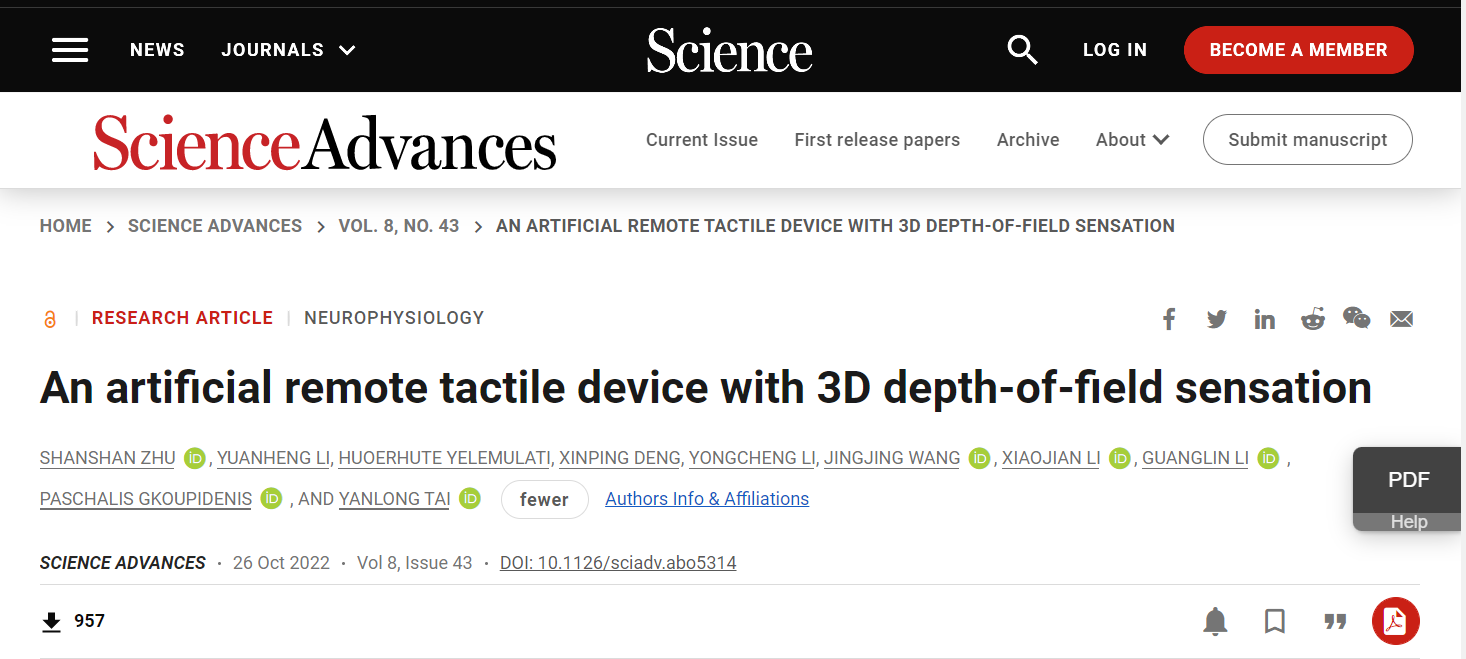近期,中科院凯发k8国际集成技术研究所神经工程中心与德国马克思普朗克聚合物研究所有机电子研究团队合作,以凯发k8国际为第一单位在Science Advances发表了题为“An artificial remote tactile device with 3D depth-of-field sensation”的文章。朱珊珊助理研究员为第一作者,李光林研究员、Prof. Paschalis Gkoupidenis和邰艳龙研究员为共同通讯作者,凯发k8国际脑认知与脑疾病研究所李骁健研究员等人对该论文脑机接口方面给予支持。