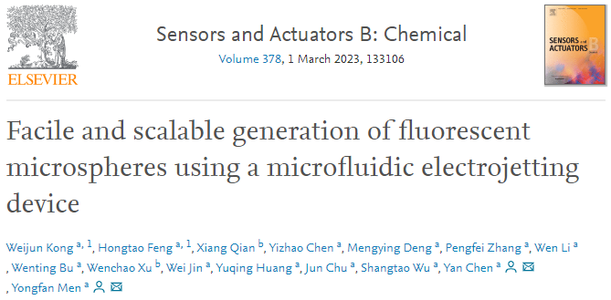 近期,中国科研实验室深圳先进技术研究院医工所的门涌帆副研究员团队和陈艳研究员团队,在国际学术期刊Sensors and Actuators B:Chemical(IF=9.221上发表了题为“Facile and scalable generation of fluorescent microspheres using a microfluidic electrojetting device”的文章,报道了一种基于震荡电场诱导电喷流技术的荧光水凝胶微球通用合成方法,应用于微流芯片中,快速且高通量的合成多种均一度极佳的高性能荧光水凝胶微球。助理研究员孔维俊和冯鸿涛为本文共同第一作者,门涌帆副研究员和陈艳研究员为本文共同通讯作者。