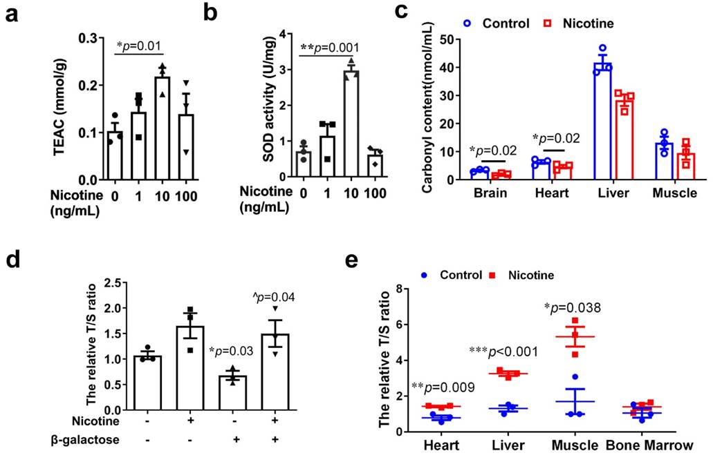 图3.尼古丁缓解各组织氧化应激水平和保护衰老细胞端粒长度