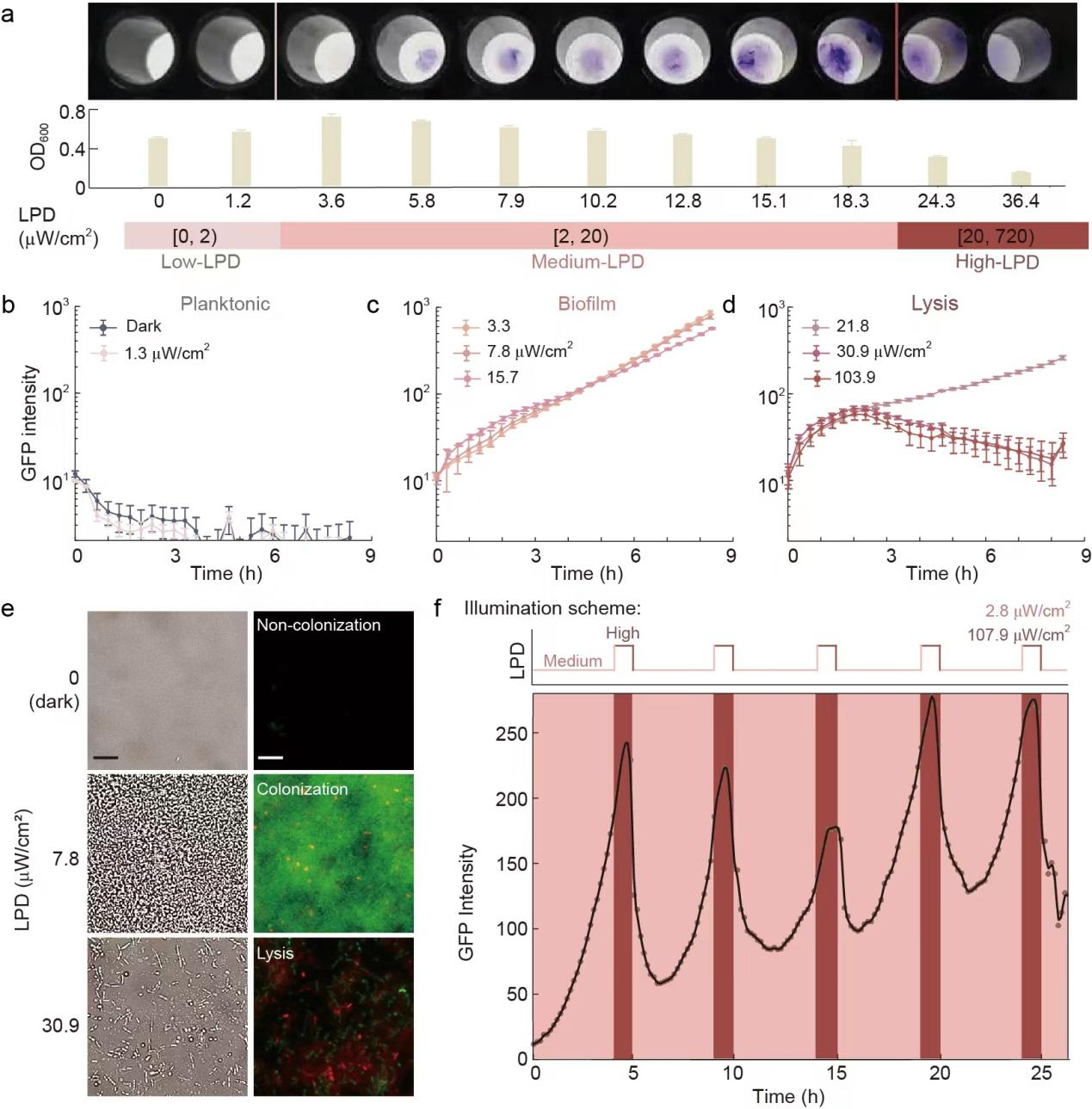 为了取得能够在不同强度的近红外光照射下呈现三种生活方式的工程菌,研究团队对RBS1和RBS2进行批量替换,并顺利获得96孔光照装置对候选菌株进行批量筛选,随后利用显微镜进行验证,最终得到的工程化菌株被命名为H017(图2)。顺利获得层级性调控近红外光的照射强度可以编程H017的生活方式,当对H017施加中等强度-高强度循环的近红外光光照程序时,细菌将进入生物被膜状态-裂解状态生活方式循环。