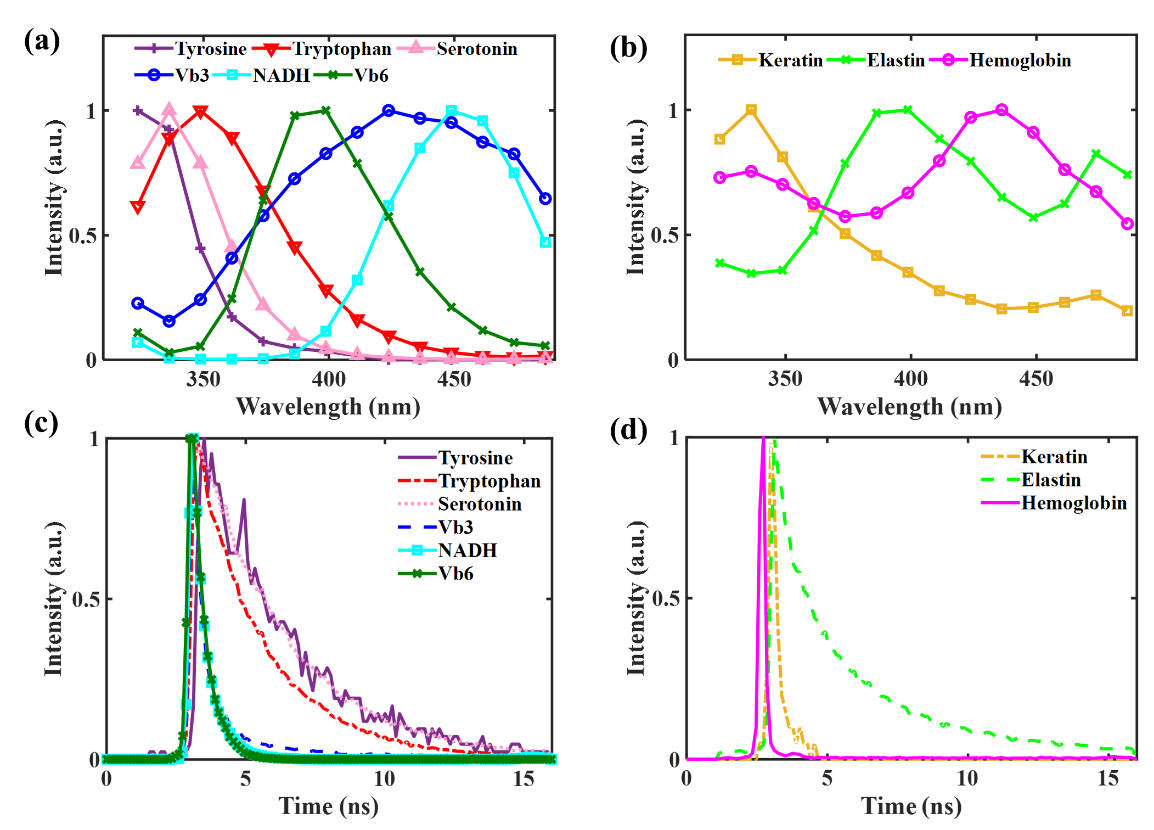 图1.生物组织中典型的短波内源性荧光团纯化学样品的荧光寿命和光谱特性