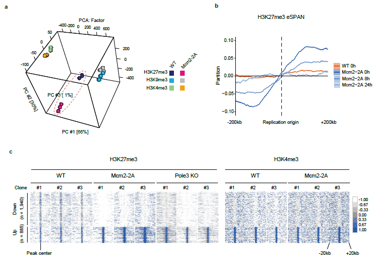 在小鼠胚胎干细胞bivalent基因的启动子位点,组蛋白变体H3.3参与建立正确的H3K27me3分布模式。顺利获得eSPAN发现在Mcm2-2A胚胎干细胞中H3.3表现出滞后链偏好。同时,H3K27me3分布的变化随着H3.3的改变而改变。亲代组蛋白分配失衡,不仅改变了缓慢重建组蛋白修饰的分布,也改变了组蛋白变体的定位,进而在全基因组范围影响组蛋白及其修饰的景观,从而改变了细胞的命运。