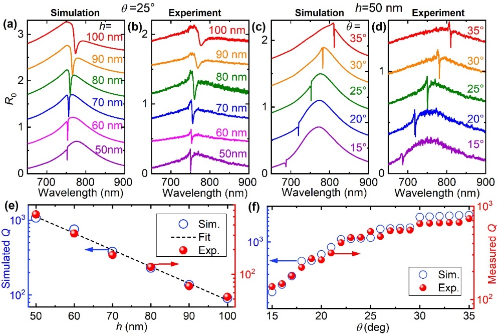 金属纳米柱阵列的高度减半,所支持的面外SLR的品质因子提高一个数量级。随着入射角度增加,面外SLR的品质因子持续提高。