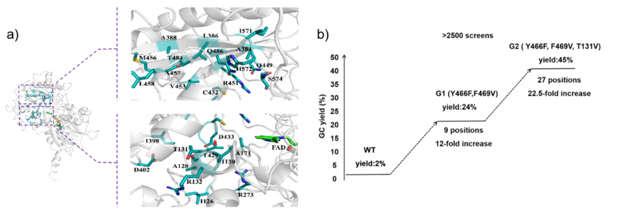 FAP作为一类具有光促脱羧活性的光酶,可以在蓝光诱导下对于油脂等天然底物进行脱羧生成相应的烷烃,但是野生型FAP对于二级、三级羧酸等大位阻的非天然底物反应活性低,限制了其应用范围。研究团队顺利获得对于野生型FAP进行基于结构的理性设计与定向进化改造,发掘了含有Y466F /F469V/T131V的三点突变体,实现了对于金刚烷酸等大位阻羧酸的光促脱羧转化。随后在对于该酶促反应的条件进一步优化中,研究团队发现使用稳定性高、易于操作的全细胞冻干粉作为催化剂可以大幅提高反应的转化率。