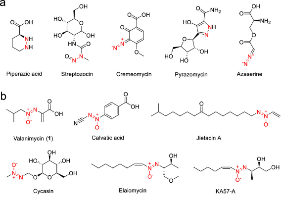图2. 部分含氮-氮(N-N)键类活性天然产物(a)及氧化偶氮家族化合物(b)