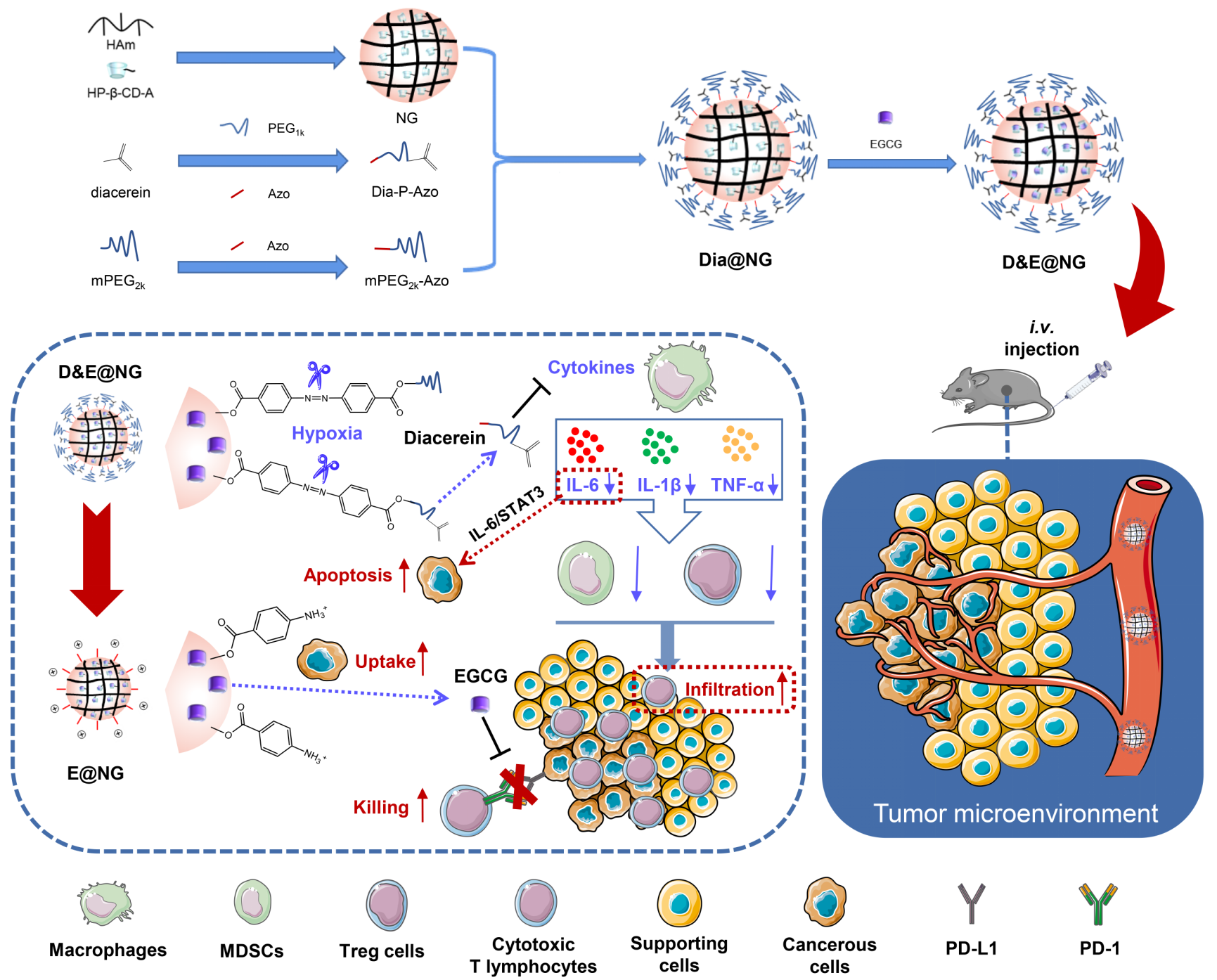 综上所述,该研究团队成功构建了一种缺氧响应型纳米凝胶(NG),用于小分子药物Diacerein和EGCG在肿瘤中的递送和渗透(图1)。静脉给药后,载体进入肿瘤微环境(TME)时,第一时间释放Diacerein,顺利获得控制肿瘤炎症环境,有效抑制MDSCs和Tregs的肿瘤浸润,同时顺利获得抑制IL-6/STAT3信号通路诱导肿瘤细胞的凋亡,实现强效抗肿瘤作用。装载于NG空腔内的EGCG在被肿瘤细胞摄取后,能有效抑制PD-L1的表达,恢复CTLs的肿瘤杀伤能力。联合TIM-3检查点阻断治疗后,肿瘤部位的CTLs浸润增加,全身免疫被有效激活,产生强烈的抗肿瘤免疫反应。这项研究为未来顺利获得控制肿瘤炎症环境实现有效的抗肿瘤免疫治疗给予了宝贵的见解。