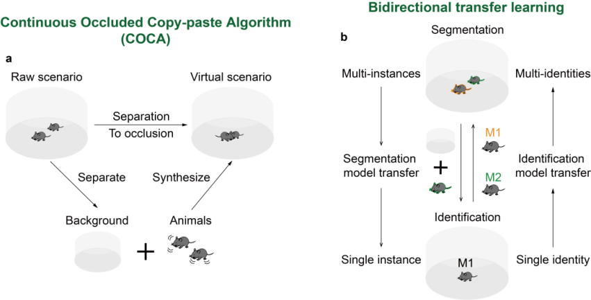 SBeA的姿态估计小样本数据生成算法和身份识别零样本双向迁移学习方法的设计均受到大脑的工作机制的启发(图1)。人类在识别交互的动物时,能 “脑补”动物可能存在的遮挡关系,这一过程为大脑给予大量的新数据。据此所提出的陆续在遮挡复制粘贴数据算法可以有效合成大量新数据(图1a),能够训练精度更高的模型,取得更加准确的3D社交姿态估计结果。在非社交场景中,人类能够顺利获得外表区分每一只动物的身份,也能“脑补”到多动物社交场景,识别每一只动物的身份。受到启发,SBeA的多动物社交身份识别顺利获得共享不同网络的知识实现双向迁移学习(图1b),借助模型之间的“脑补”,消除了标注数据的过程,并实现了高精度的外表相似动物的身份识别。