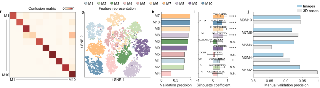上述现有欧美技术的性能第一时间受制于人工标注数据集的数据量。在社交行为实验中,无法避免地需要在多种行为实验范式中使用不同的模式动物,深度学习模型精准与否取决于实验人员标注的视频的数量,每一个数据集的准备都需要花费实验人员数周的时间,极大地降低了实验效率,限制了上述工具的应用场景。SBeA在自由社交动物的姿态估计、身份识别和行为分类的三个阶段,分别针对性地提出了小样本的数据生成算法、零样本双向迁移学习方法和自然结构启发的无监督社交行为分解聚类策略,有效降低了每个阶段的数据标注量。