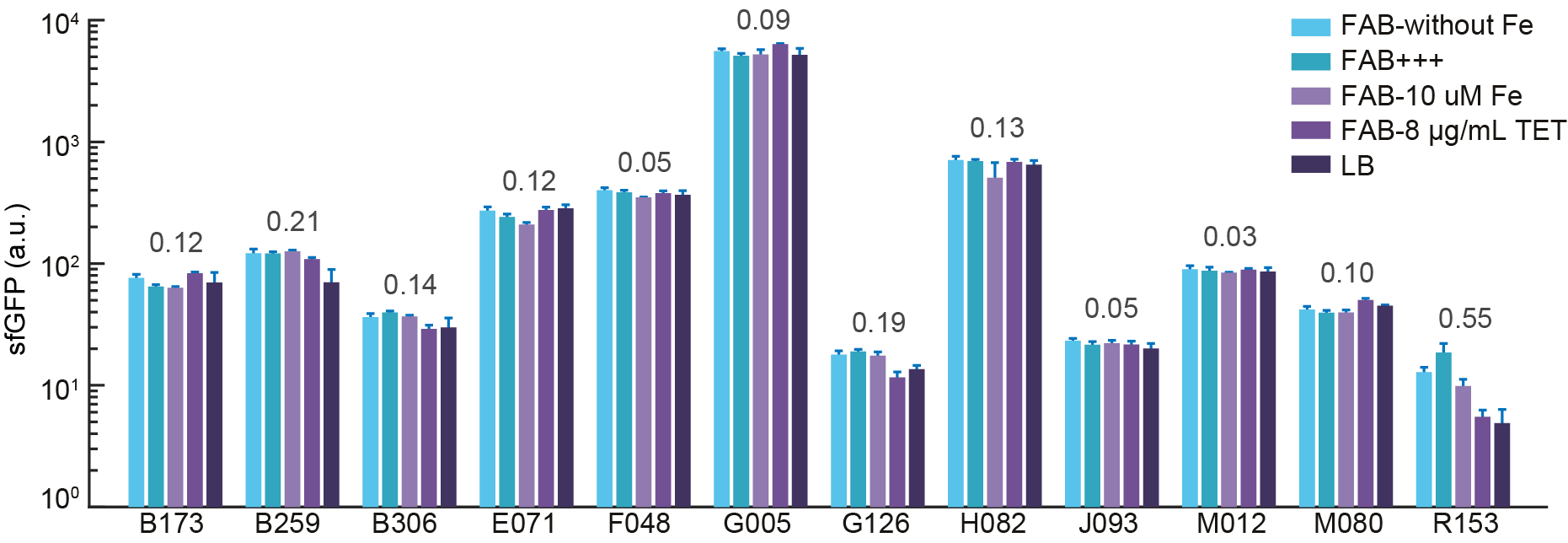 图三:启动子在KT2440底盘菌株中鲁棒性的测试。