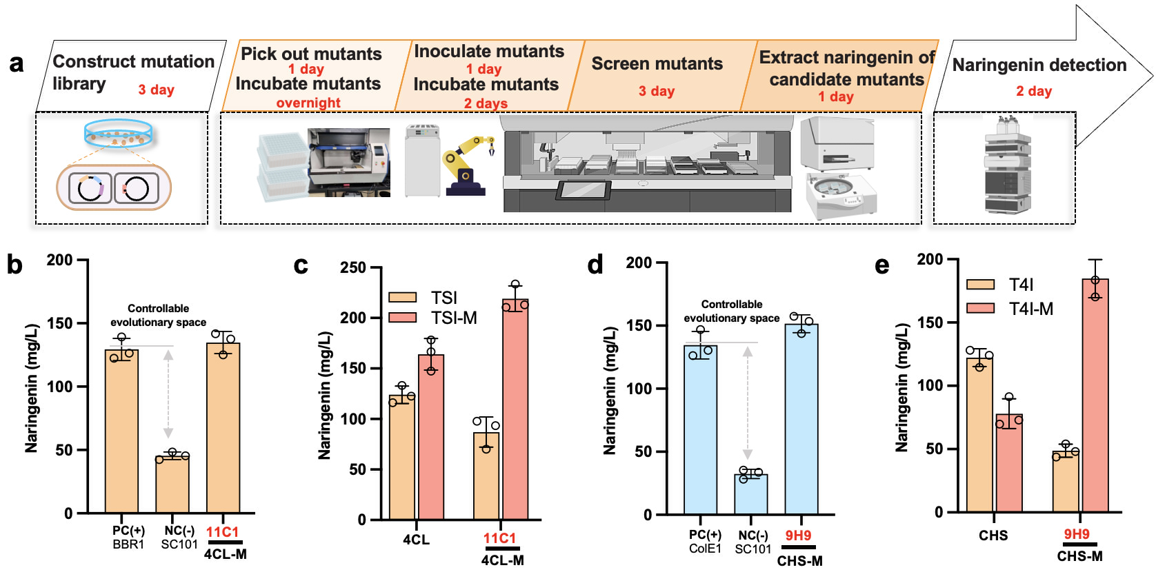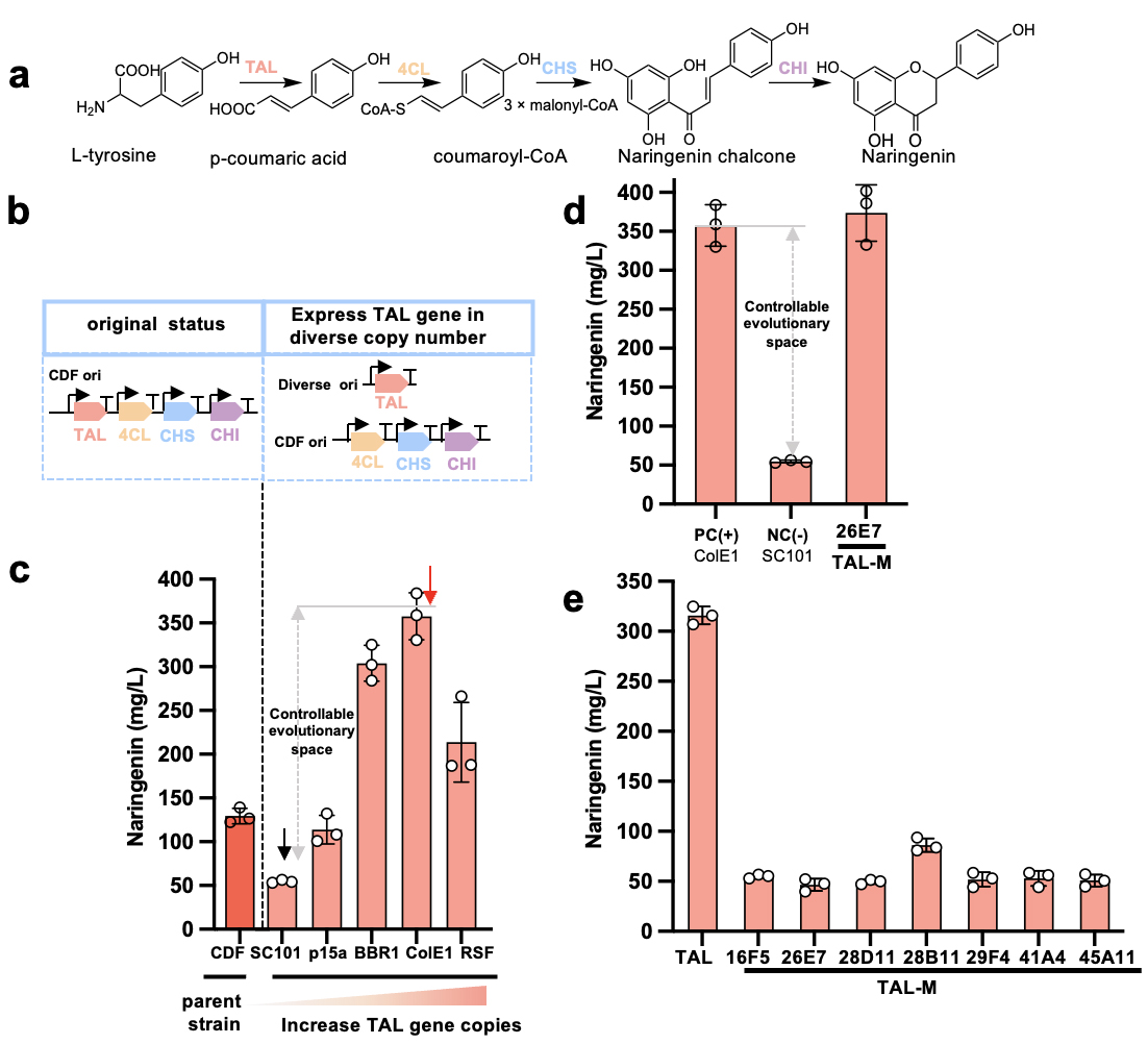 改变外部环境可重塑途径进化适应度特性,解决代谢途径进化陷入局部最优解的困局。因此,研究团队逐个降低各关键基因表达水平,进而改变代谢途径关键性基因进化的适应性。为了达成同步自动化辅助酶进化,研究团队还进行了如下设计:1)仅用终产物柚皮素响应的分子探针系统作为评估途径代谢能力的标准,以实现统一的筛选方法;2)搭载自动化大设施平台技术,在清晰进化轨迹内实现各基因同步、迭代进化。