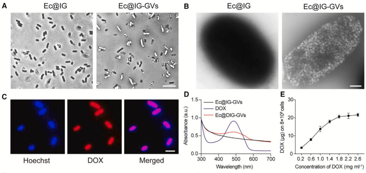 研究团队第一时间将声学报告基因(ARG1)质粒和温控基因线路(IFN-γ)质粒依次导入至大肠杆菌MG1655中,取得了Ec@IG,接着在体外诱导Ec@IG内的声学报告基因表达GVs取得含生物纳泡细菌Ec@IG-GVs。最后,利用化学修饰策略将阿霉素连接至Ec@IG-GVs表面制备取得了超声可视化的工程化细菌Ec@DIG-GVs。透射电镜及相差显微镜结果证实Ec@DIG-GVs细菌内部表达了大量的生物纳泡(GVs),免疫荧光标记和吸收光值测定表明阿霉素成功偶联至细菌表面(图1)。