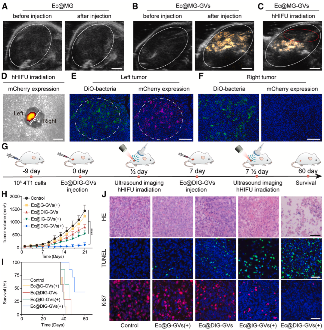 接着研究团队将该工程化细菌应用到荷瘤小鼠中,顺利获得瘤内注射Ec@MG或Ec@MG-GVs,发现Ec@MG-GVs展现出良好的肿瘤内超声成像能力,顺利获得超声成像定位肿瘤内细菌位置并引导hHIFU进行辐照。结果显示在同一个肿瘤内仅仅经过hHIFU辐照的区域超声信号消失,4小时后辐照区有红色荧光产生(mCherry蛋白表达),而未辐照区域无红色荧光。切片结果显示辐照区域所产生的红色荧光呈近似圆形,能与hHIFU辐照焦点相对应。利用该方法进行超声成像引导hHIFU辐照Ec@DIG-GVs进行肿瘤治疗,肿瘤生长可以得到明显的抑制,并延长荷瘤小鼠的生存期(图4)。