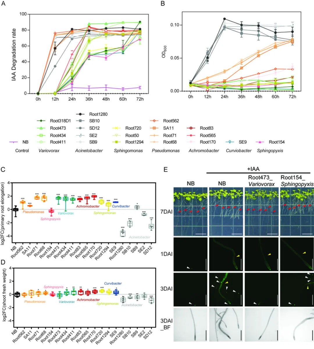 基于这些研究问题,研究团队第一时间运用比较基因组学与体外降解实验相结合的方法,系统性评估了从拟南芥(Arabidopsis thaliana)和水稻(Oryza sativa)根部分离的183株细菌的IAA代谢能力。最终鉴定出来自7个属的共21株细菌具有IAA降解活性,其中包括之前未被报道过的新菌属(图1)。