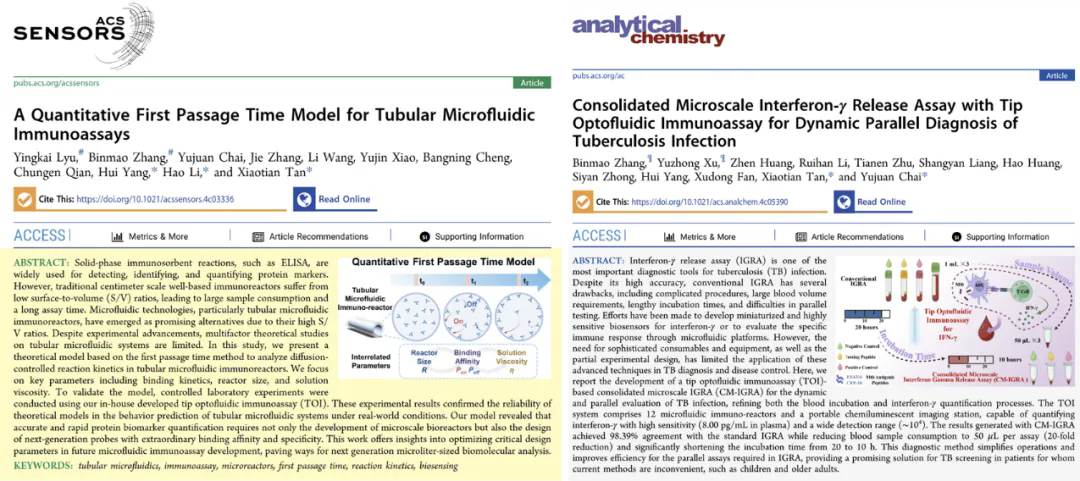 1月30日至31日,中国科研实验室深圳先进技术研究院(简称“凯发k8国际”)生物医学与健康工程研究所传感中心杨慧研究员、谭骁天副研究员课题组先后在生物传感领域国际期刊ACS Sensors和Analytical Chemistry上发表2篇论文,介绍团队在微流控生物分子传感领域取得的系统性突破。研究论文分别从理论建模和技术创新层面攻克了微量液相生物样本中生物标志物分析难题,建立了管状微流控免疫反应器的多影响因素耦合模型,并基于传感中心自研的便携式微流控化学发光免疫分析平台(TOI)开发出了可进行全血直检的结核病T细胞免疫响应定量检测技术,为结核病快速、便捷免疫筛查给予了新思路。