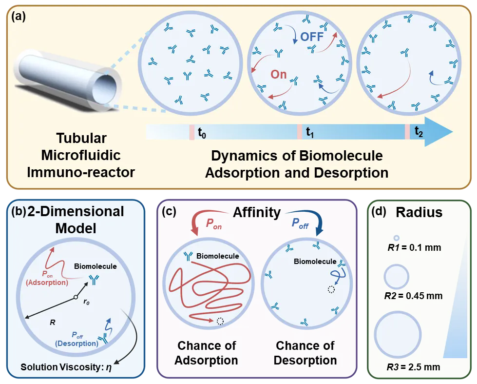 微流控生物传感技术凭借其样本需求量小、可快速响应和设备便携等优势,已成为传染病诊断及免疫反应检测领域的前沿技术。然而,该类技术从技术验证走向实际应用始终面临两大核心挑战:其一,微流控系统设计缺乏普适性理论指导,反应器几何参数(如反应器半径)与分子结合效率的定量关系尚未明确,导致器件开发严重依赖经验试错;其二,复杂生物样本(如全血)中的基质干扰和分子探针性能不足,使得检测灵敏度、特异性与信噪比难以满足临床需求。