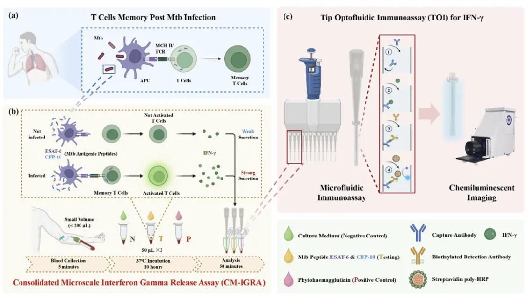 基于理论模型的指导,研究团队开发出了一套便携式微流控化学发光免疫分析系统(TOI),及配套的一体式微尺度干扰素释放测试技术(CM-IGRA)。可用于结核病T细胞免疫响应的精准检测。该技术探测目标为血液中T细胞针对结核分歧杆菌特异性抗原肽分泌的干扰素γ(IFN-γ)。仅需50 μL血液样本即可完成检测。从采血开始的全分析流程仅需约12小时,较传统方法的20-24小时缩短近一半。顺利获得优化抗体探针和信号放大策略,系统对IFN-γ的检测灵敏度达到8.00 pg/mL(血浆样本),动态范围横跨近4个浓度量级。