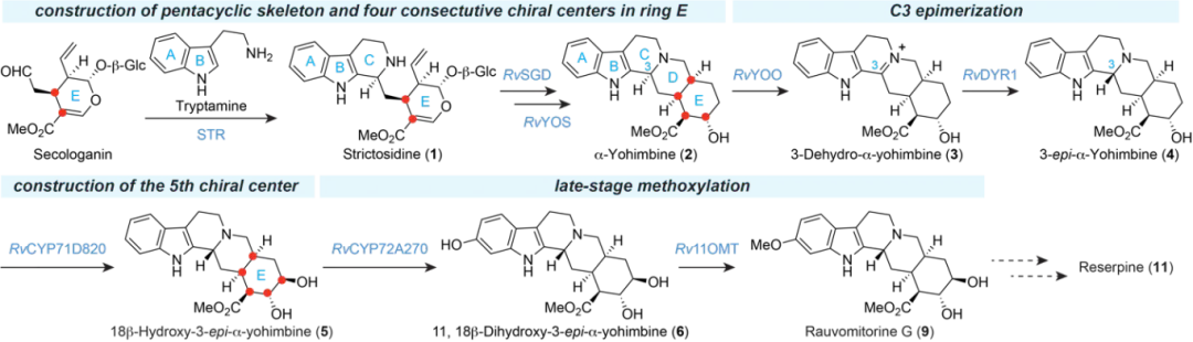研究团队第一时间顺利获得萝芙木(Rauvolfia verticillata)转录组分析,确定了常见的单萜吲哚生物碱生物合成中间体异胡豆苷(1)是利血平合成的关键中间体。在此基础上,他们鉴定出实现构型翻转的关键酶系统。团队从萝芙木中鉴定出关键的黄素依赖性氧化酶RvYOO和NADPH依赖性还原酶RvDYR1。RvYOO能够将具有C3α构型的α-育亨宾(2)氧化生成亚胺中间体3,随后RvDYR1立体专一性地还原这个中间体,最终生成具有C3β构型的3-表-α-育亨宾(4)。