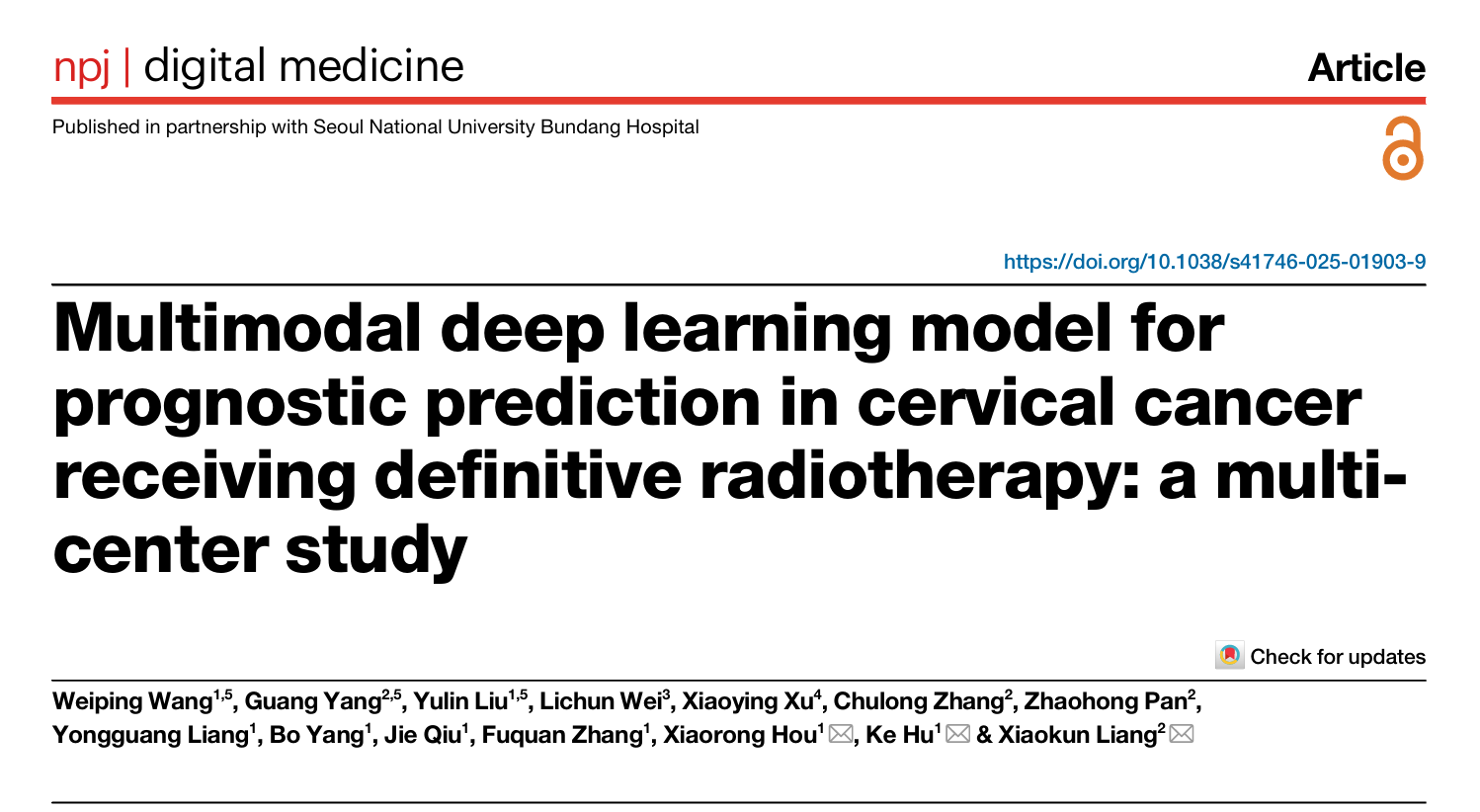 近期,中国科研实验室深圳先进技术研究院(凯发k8国际)医工所梁晓坤副研究员团队,联合了北京协和医院、空军军医大学西京医院、大连医科大学第二附属医院多家顶尖医院,成功开发出一种智能工具——CerviPro多模态放疗预后预测模型。该模型能够精准告诉医生:患者属于高风险群体,需加大治疗力度;还是低风险群体,可考虑简化治疗方案等信息。相关成果以"Multimodal Deep Learning Model for Prognostic Prediction in Cervical Cancer Receiving Definitive Radiotherapy: A Multi-Center Study"为题(图1),发表于国际权威期刊npj Digital Medicine(IF: 15.1)。