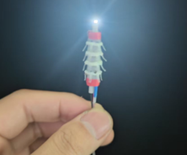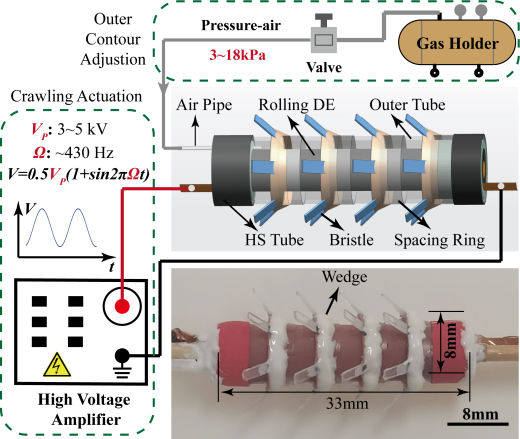团队提出了一种DEA与气动单元结合的高爬行速度、大变径比且能长距离爬行的亚厘米级管道/腔道机器人。它主体由中心内嵌的卷制型DEA、可变形充气外胆以及24个弹性铰链鬓毛组成(图2)。主要亮点如下: