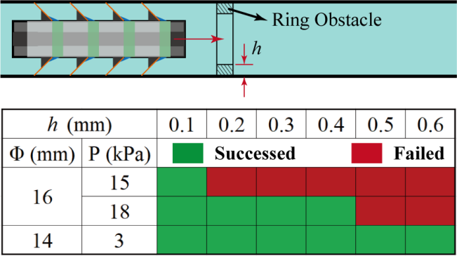 传统电机驱动的管道内爬行机器人解决了大直径管道内巡检需求,但无法满足小直径管道(≤20mm)。以气动或智能材料驱动器为驱动单元是实现管道内爬行机器人微小型化的关键,但面临高效率(爬行速度)、长距离与大变径比(最大适应管径与最小适应管径之比)无法兼得的问题。例如,气动机器人可以实现大变径比,但由于气体/管壁摩擦阻尼,远距离响应迟滞严重。DEA驱动的爬行机器人虽然可以实现1BL/s以上的爬行速度,但变径比仅有1.1,限制了障碍顺利获得能力。