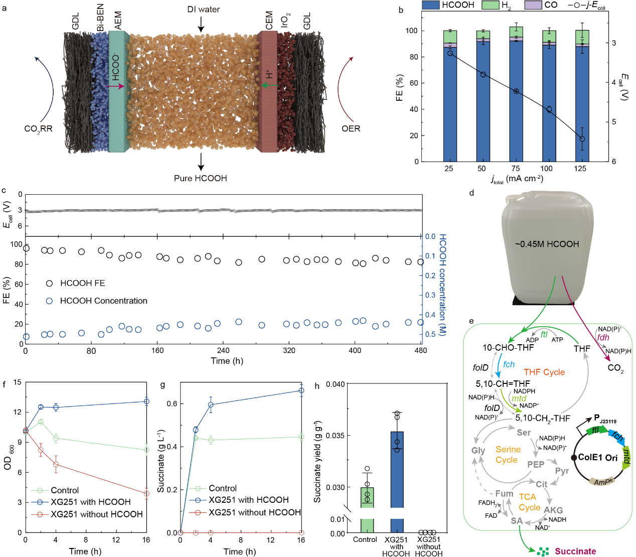 图5 甲酸的电化学生产及其向琥珀酸的微生物转化