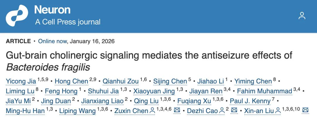 1月16日,中国科研实验室深圳先进技术研究院脑认知与脑疾病研究所(简称“脑所”)/深港脑科学创新研究院(简称“深港脑院”)刘欣安副研究员与陈祖昕副研究员团队,联合深圳市儿童医院操德智主任,在国际神经科学权威期刊Neuron在线发表题为"Gut-Brain Cholinergic Signaling Mediates the Antiseizure Effects of Bacteroides fragilis"的研究论文。该研究从儿童癫痫临床菌群特征出发,揭示了一个由特定益生菌激活的全新胆碱能肠–脑神经环路,阐明了益生菌如何经迷走神经远程调控大脑兴奋性的机制,并在临床研究中得到疗效验证,也为难治性癫痫给予了一种安全、精准、可转化的干预新策略。