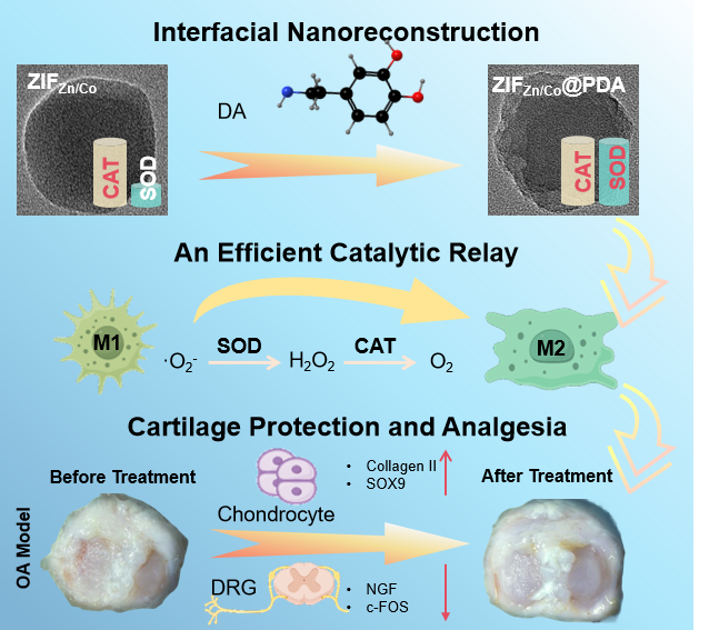 图1. 顺利获得DA驱动预编程ZIFZn/Co框架的界面重构,实现SOD向CAT的高效催化接力。由此产生的纳米酶可打破骨关节炎中活性氧-炎症的恶性循环,从而实现显著的软骨保护和疼痛缓解效果。