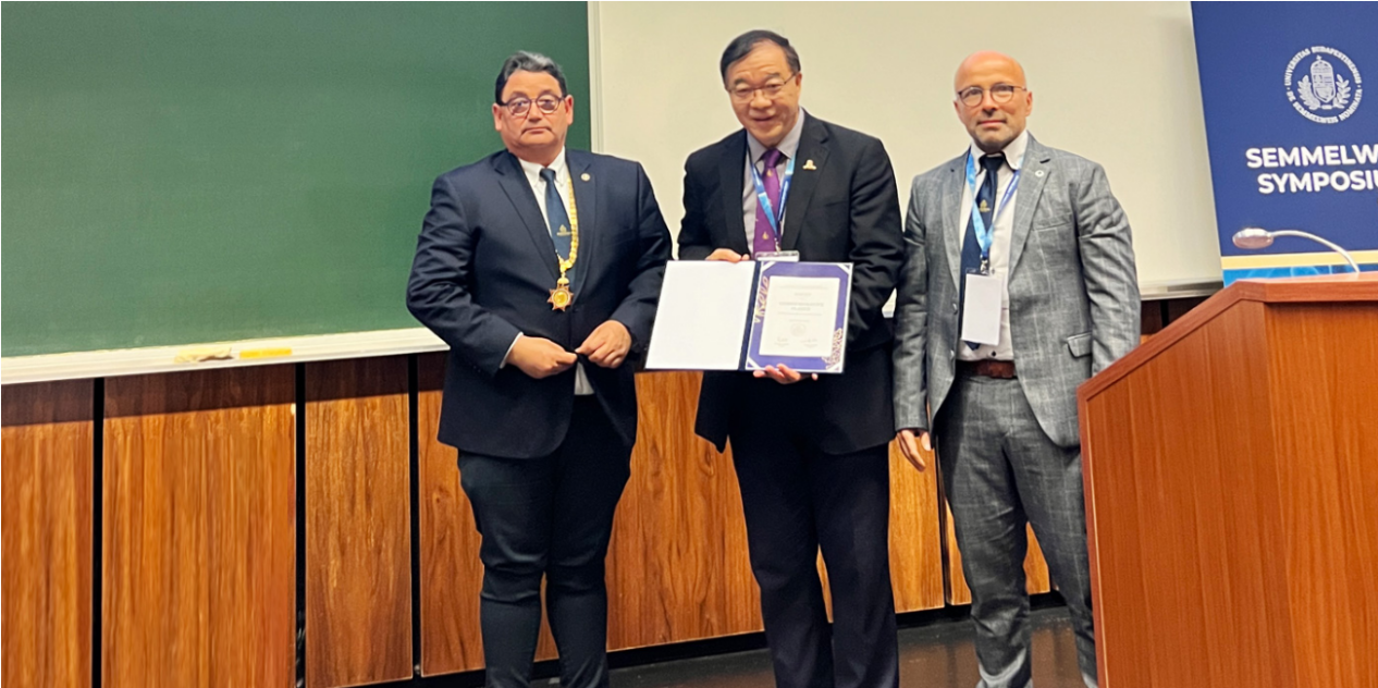 欧洲科学院临床与兽医学部主任P ter Hegyi (右一)与塞梅维什大学(Semmelweis University)校长B la Merkely教授颁发证书予秦岭教授,以表彰秦岭教授为促进欧亚科研合作所作的努力