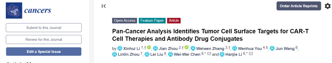 近期,中国科研实验室深圳先进技术研究院合成生物学研究所李汉杰课题组在国际学术期刊cancers上发表了题为《Pan-Cancer Analysis Identifies Tumor Cell Surface Targets for CAR-T Cell Therapies and Antibody Drug Conjugates》的研究成果。
