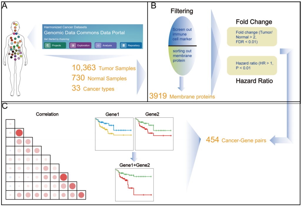 事实上,现在细胞治疗的手段只在少部分血液肿瘤中有较好的疗效,主要是由于实体瘤结构致密,血液中回输的嵌合抗原受体的免疫细胞(主要有CAR-T, CAR-NK等)很难与肿瘤细胞充分接触,从而达到杀伤肿瘤细胞的效果。另一方面,由于现行的治疗手段大多是单一靶标,因此在治疗时往往会出现杀伤效率低,易脱靶的现象。另外,大量研究和临床治疗选择的靶点虽然在肿瘤细胞中表达较高,但其在某些免疫细胞中的表达也很高,这就会造成治疗过程中,攻击患者的免疫系统,造成更严重的后果[2, 3]。基于以上现状,研究团队试图顺利获得公共数据的分析和一系列条件筛选,获取一批能够克服以上缺点的候选靶点。