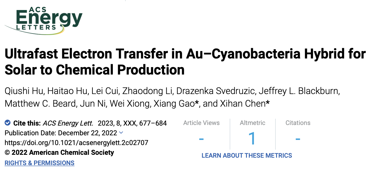 北京时间12月23日,南方科技大学机械与能源工程系陈熹翰课题组与中国科研实验室深圳先进技术研究院合成所材料合成生物学研究中心高翔课题组在ACS Energy Letters合作发表题为 “Ultrafast electron transfer in Au–Cyanobacteria Hybrid for Solar to Chemical Production” 的文章。该工作构建了金纳米颗粒-蓝细菌杂合体,将光能驱动CO2合成化学品的效率提高14%。顺利获得瞬态吸收光谱直接观察到金纳米颗粒(Au)吸收光能产生的电子,可以直接被蓝细菌细胞快速吸收。为解析电子在材料-微生物界面传递机制给予基础。南方科技大学博士生胡秋实、深圳先进技术研究院研究助理胡海涛、博士后崔蕾为文章的共同第一作者。南方科技大学陈熹翰副教授和深圳先进技术研究院高翔副研究员为文章共同通讯作者。