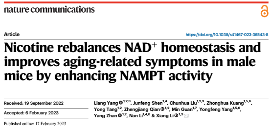 1. Yang, L. et al. Nicotine rebalances NAD+ homeostasis and improves aging-related symptoms in male mice by enhancing NAMPT activity. Nature Communications 14, 900, doi:10.1038/s41467-023-36543-8 (2023).