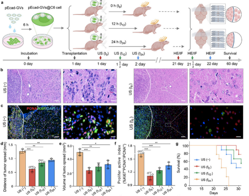研究团队利用该系统递送具有抑制肿瘤转移功能的E-cadherin基因,发现在C6脑胶质瘤细胞内吞载E-cadherin的纳泡后,移植到老鼠大脑分别等待0 h (t0),12 h (t12)或24 h (t24)进行超声辐照诱导生物纳泡胞内空化进行基因的核内递送,均能有效抑制肿瘤细胞的迁移,并能延长荷瘤鼠的生存期。为了探索超声胞内空化核内基因递送在细胞周期内的应用,研究团队建立了两种不同的细胞周期运行模式,分别将肿瘤细胞同步化停留在不同细胞周期后进行超声基因转染和同步化细胞撤掉细胞周期阻滞剂进入到不同细胞周期后接受超声基因转染(肿瘤细胞先行内吞载基因纳泡)。实验结果证实开发的核内基因递送方法在两种细胞周期运行模式中的G1期、S期和G2/M期均具有相似的基因转染效率,但在抑制肿瘤细胞侵袭和转移的功能上却有所不同,表现为在G2/M期行超声核内基因递送比G1期和S期具有更好的抗肿瘤侵袭和转移的效果。