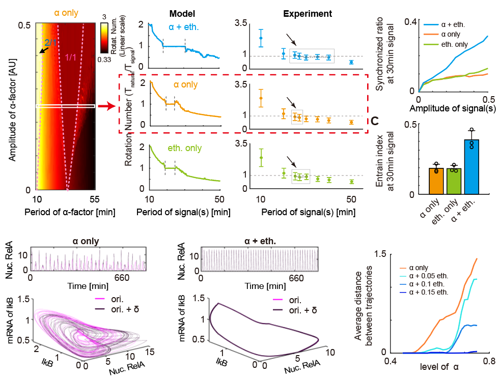 基于这一系统结合数学模型,作者发现,双重周期信号同时存在能够显著地提高内外振荡同步化的范围、降低细胞群体振荡动力学的差异、提高同步化细胞在群体中所占的比例。模型模拟结果更表明,双输入条件能够推迟混沌的发生。这些结果说明了外界两种周期信号对系统的作用并不是简单的线性叠加,而是以一种相互协同的形式产生作用。