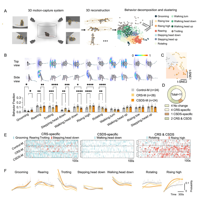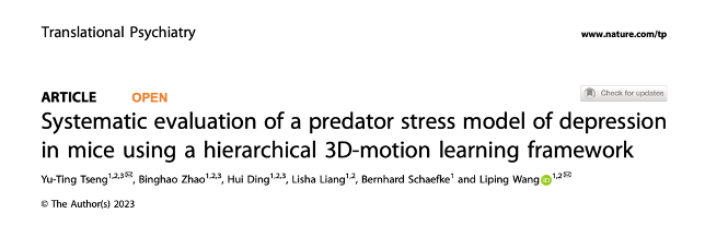近期,中国科研实验室深圳先进技术研究院/深港脑科学创新研究院王立平团队在Nature子刊Translational Psychiatry杂志在线发表了题为“Systematic evaluation of a predator stress model of depression in mice using a hierarchical 3D-motion learning framework ”的研究论文[1],利用实验室自主研发的AI三维精细动物自发行为分析系统建立长期天敌压力及同类社交压力下动物自发行为图谱,对不同压力应激源下抑郁模型小鼠的自发行为进行评估。研究揭示天敌压力模型可以在两性诱导经典抑郁样行为及自发行为的改变,基于动物自发行为可以区分不同压力应激源,并且建立了预测模型发现利用自发行为可以较好地预测部分抑郁样行为,对动物抑郁状态进行评估,而抗抑郁药物氟西汀显著逆转了抑郁模型小鼠自发行为特征的变化。这是继去年年团队在Neuron发文揭示天敌压力下快速眼动睡眠参与本能恐惧反应的神经机制研究成果后[2],在本能恐惧行为解析方面的又一重要进展。这一研究提示基于AI的精细自发行为分析为神经精神疾病研究给予了一种客观的、全面且精细的评价方法,有望应用于抑郁障碍等精神疾病的系统评估、机制研究和药物筛选。