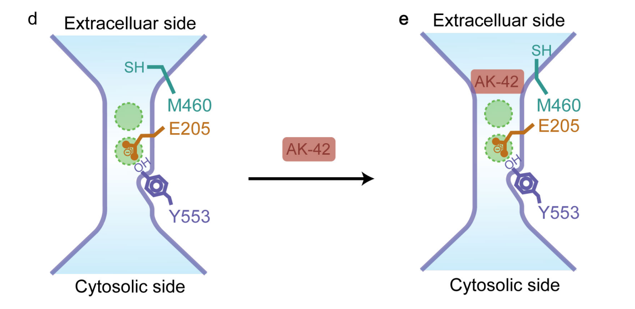 2020年,美国斯坦福大学Anna Koster等研究者顺利获得检测甲氯灭酸的一系列衍生物与ClC-2的结合强度,最终得到与ClC-2特异性结合的衍生物AK-42;其结合ClC-2的强度(IC50 = 17 ± 1 nM)是ClC-1(与ClC-2结构最为相似)1000倍以上。为进一步探究AK-42是如何特异性结合ClC-2并抑制其氯离子转运功能,研究团队顺利获得冷冻电镜确定了apo态的ClC-2ClC-2/AK-42复合物的高分辨率原子结构,基于结构顺利获得分子动力学模拟确定参与复合物结合界面的关键氨基酸残基,利用点突变和膜片钳技术进一步验证关键氨基酸残基,最终提出特异性抑制剂AK-42堵塞ClC-2机制(如图)。该研究为后续特异性药物设计给予新思路。