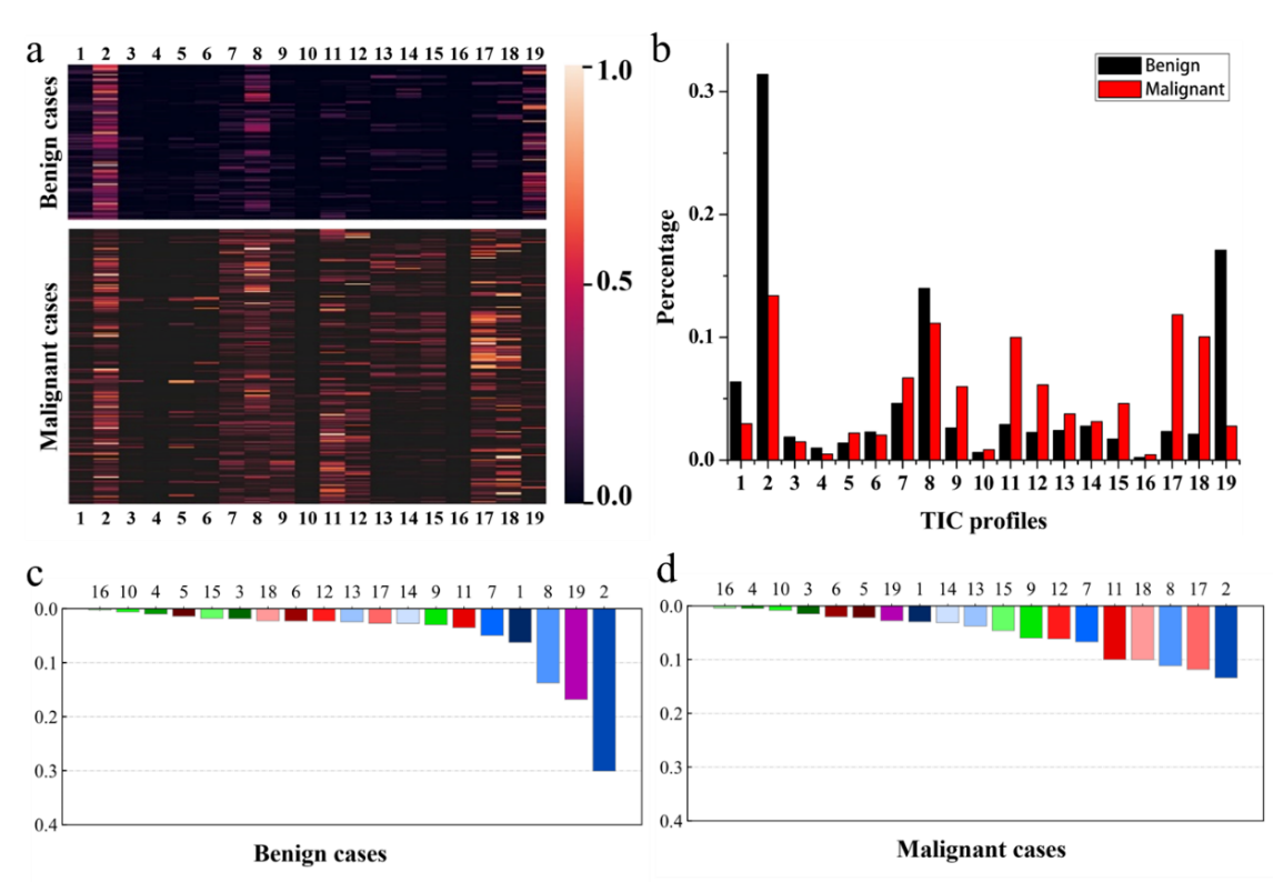图3 使用Type-19特征集区分乳腺癌病灶的恶性程度。所有良性和恶性乳腺病灶的热图分布(a)和条形对比图(b),以及良性病灶(c)和恶性病灶(d)Type-19特征集排名条形图。