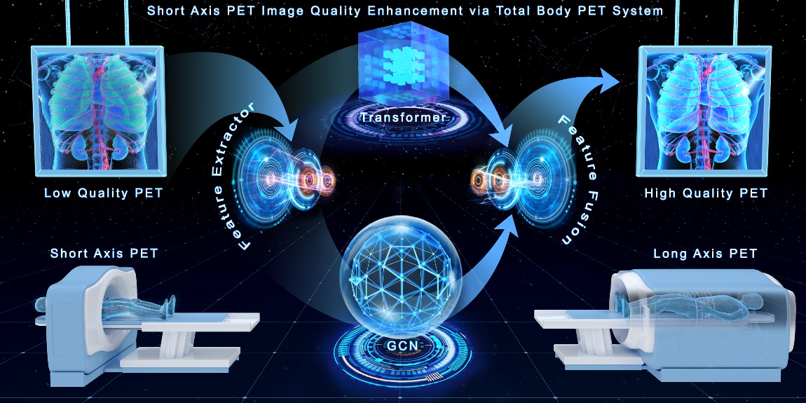 现有临床PET/CT系统由于轴向视野限制,在分辨率、扫描时间和辐射剂量等方面还有较大提升空间。最近,联影医疗推出的2米PET/CT可以同时实现人体全身PET成像、有效提高图像质量并降低辐射剂量。基于2米PET/CT获取的高质量图像,团队研发了一种短轴PET/CT系统的图像质量提升技术,可以实现短轴PET/CT重建图像的质量增强,以弥补其硬件上的轴向视野不足问题。提出模型采用Swin-Transformer和Watts-Strogatz拓扑结构双支设计,在短轴PET图像信息提取的同时兼顾空间和通道两个维度信息。实验结果表明,与现有深度学习和去噪方法相比,提出技术可以有效提高重建图像的信噪比和细节恢复能力。