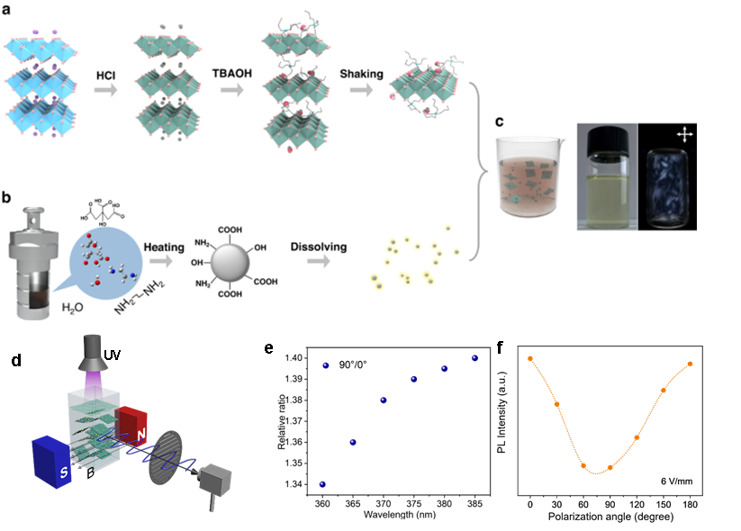 中国科研实验室深圳先进技术研究所的丁宝福、成会明和王锋利用“维度联姻”的概念将蓝色无机碳点耦合到2D纳米片上,创造了一个全无机的0D碳点/2D纳米片异质结发光系统(图1 a-c)。这一成就实现了一种结合高发光效率和偏振特性的蓝色发光材料的开发,为扩大偏振发光材料家族给予了一种新的方法。构建的0D/2D异质结构顺利获得化学吸附诱导Ti-O-C键的形成,有效地锚定了0D碳点。顺利获得将零维发光材料缺乏各向异性的高发光效率与二维材料强大的光偏振调制能力相结合,使两种低维材料的光学特性互补,从而实现碳点的偏振发光。此外,利用异质结的二向色吸收,实现了360-385 nm范围内的紫外光检测。该方式首次集成偏振光发射,紫外光检测和可见光调制的多功能光电器件的构建。