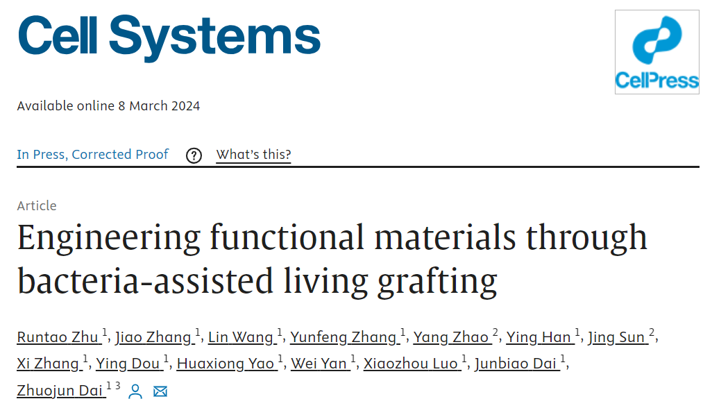 1. Runtao Zhu,Jiao Zhang,Lin Wang,Yunfeng Zhang,Yang Zhao,Ying Han,Jing Sun,Xi Zhang,Ying Dou,Huaxiong Yao,Wei Yan,Xiaozhou Luo,Junbiao Dai,Zhuojun Dai*. Engineering Functional Materials through Bacteria-assisted Living Grafting. Cell systems. 2024. DOI: 10.1016/j.cels.2024.02.003