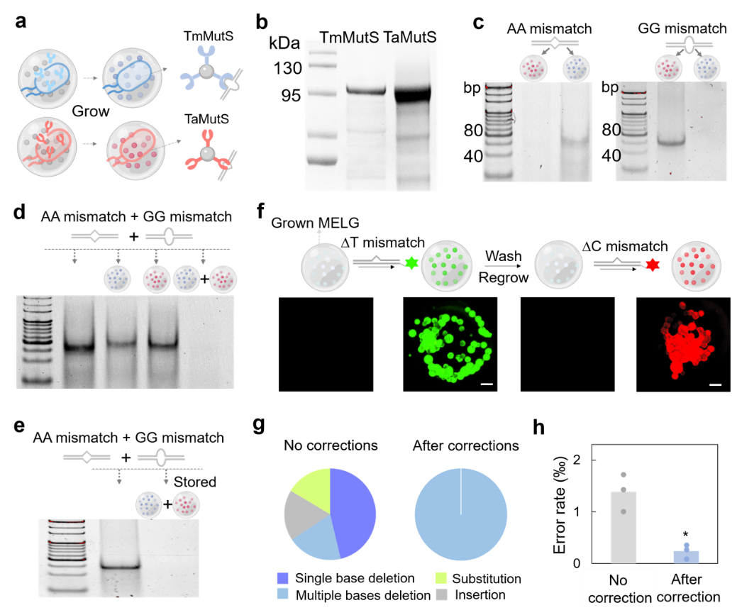 图2. MutS接枝MELG移除错配DNA。a. 不同MutS接枝MELG对不同错配DNA的结合具有差异。b. E. coli释放TaMutS和TmMutS。c. MutS接枝MELG具有不同的结合偏好。d. 组合MELG去除了大部分错配DNA。e. MELG随长随用。f. MELG二次生长,再利用。g. 除多碱基缺失外,几乎所有错误都被MELG消除。h. 经MELG校正后,总体错误率降低。