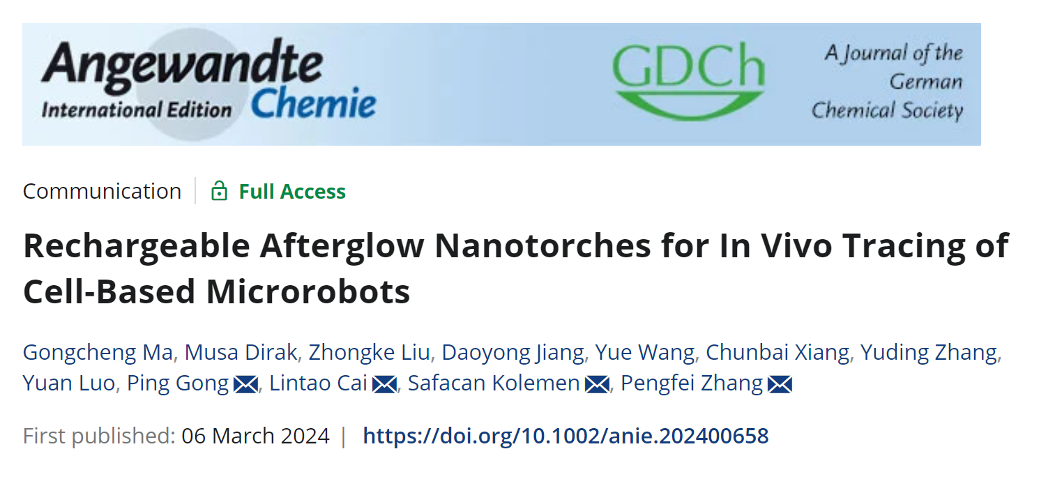 近年来,微/纳机器人的飞速开展,在生物医学领域展现出了巨大的应用潜力。但是,如何在体内长时程的对微/纳机器人进行定位与示踪面对巨大挑战。36日,中国科研实验室深圳先进技术研究院蔡林涛研究员团队张鹏飞副研究员、龚萍研究员等和土耳其科奇大学(Koc University) Safacan Kolemen教授合作,在国际学术期刊Angewandte Chemie International Edition发表研究论文“Rechargeable Afterglow Nanotorches for In Vivo Tracing of Cell-Based Microrobots”