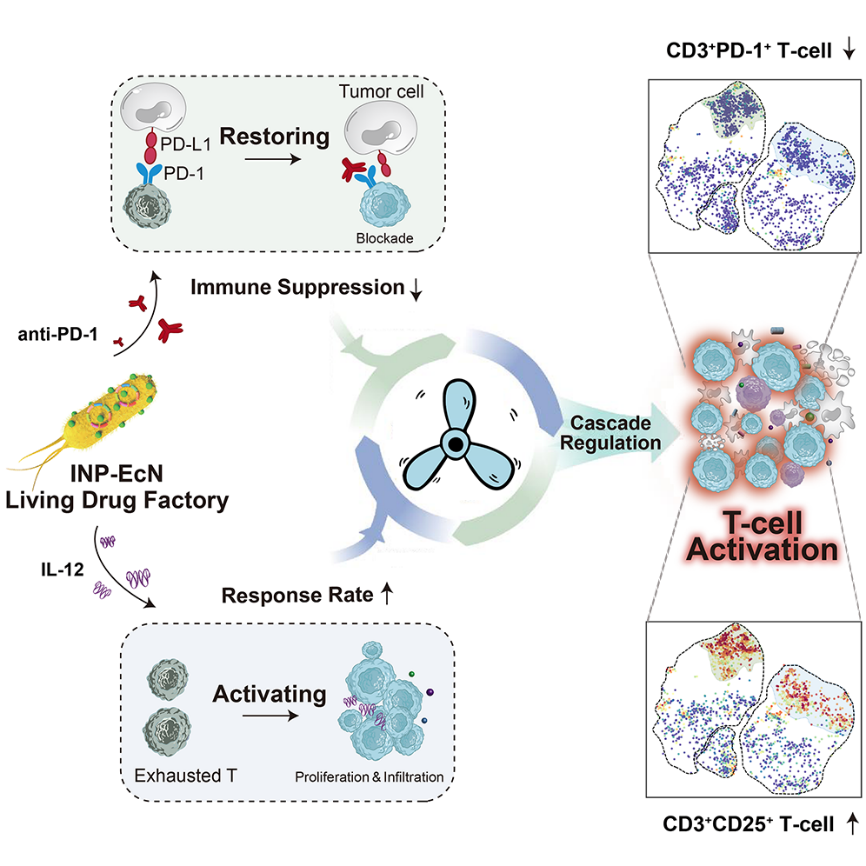 近期,中国科研实验室凯发k8国际技术研究院蔡林涛研究员团队和南昌大学陈廷涛研究员课题组合作在Cell 旗下知名刊物Cell Reports上线发表了题为“T cell cascade regulation initiating systemic antitumor immunity through living drug factory of anti-PD-1/IL-12 engineered probiotics”的研究成果。该研究介绍了一种纳米工程益生菌“活药物工厂”,它能够在体内持续生物合成anti-PD-1抗体以缓解T细胞免疫抑制,同时能肿瘤微环境响应释放IL-12激动剂,有效促进T细胞的活化、增殖和浸润,从而为免疫检查点阻断给予了充足的免疫靶点(激活阈值),并顺利获得对T细胞的“松刹车+踩油门”实现其对肿瘤微环境的免疫级联调控与精准高效治疗。