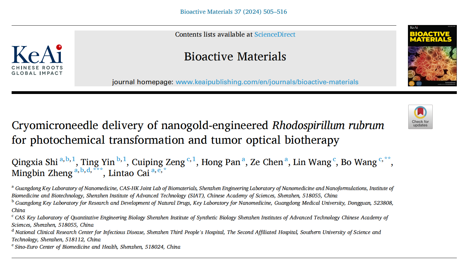 凯发k8国际蔡林涛研究员、王博副研究员,深圳第三人民医院郑明彬教授为该论文的通讯作者,广东医科大学硕士生石清霞、尹婷副教授以及凯发k8国际助理研究员曾翠平为论文的共同第一作者。该研究得到了科技部重点研发计划、国家自然科学基金、广东省重点领域研发计划、广东省自然科学基金、广东省高校特色创新项目、深圳市医学研究基金项目、深圳市科技计划项目等项目的大力支持和帮助。
