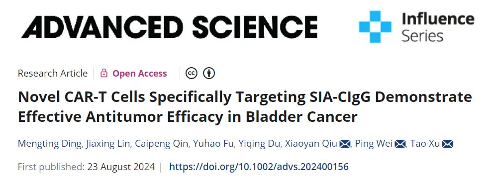 2024年8月23日,中国科研实验室深圳先进技术研究院合成生物学研究所细胞与基因线路设计中心魏平课题组联合北京大学人民医院泌尿外科徐涛课题组和北京大学基础医学院邱晓彦团队,在Advanced Science在线发表题为“Novel CAR-T Cells Specifically Targeting SIA-CIgG Demonstrate Effective Antitumor Efficacy in Bladder Cancer”的研究论文,报道了一种新型CAR-T细胞,能够特异性靶向SIA-CIgG表达阳性的膀胱癌细胞,发挥抗肿瘤作用。