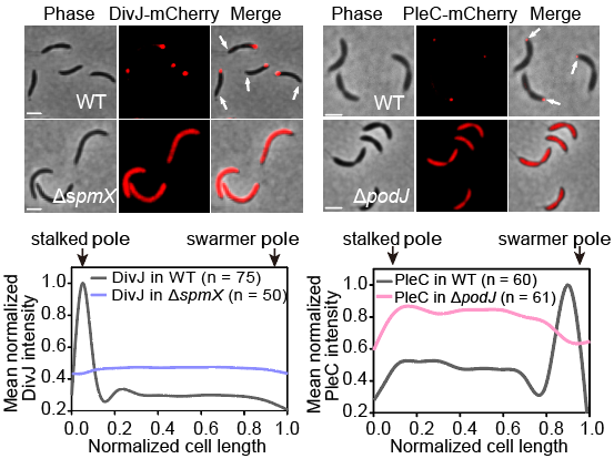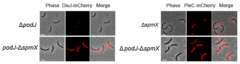 图3. DivJ-mCherry和PleC-mCherry分别在单敲除突变体ΔpodJ和ΔspmX中的分布
