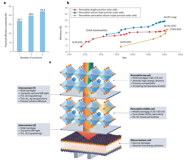 模拟结果显示,钙钛矿-钙钛矿-硅三结电池的理论效率可达44.3%,比双结电池的理论极限(39.5%)高出约5个百分点。在实际气候条件下,该类三结器件的发电量比单结电池提升33–46%,比双结电池高约8%,展现出巨大的应用潜力。