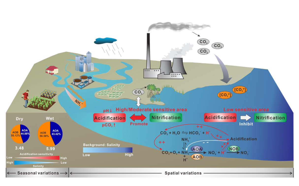 同时,研究进一步发现,长期富营养化状态下,珠江口水体酸化速率远高于开阔海域。在伶仃洋中游区域(即40公里的“源—汇”转换阈值处)形成了显著的“酸化–硝化”耦合热点。在该热点中,氨氧化微生物以铵盐为“燃料”进行硝化作用,每次反应都会释放出氢离子,削弱水体碱度并导致pH下降,形成局部“酸化中心”。该发现揭示了珠江口河口系统中存在一个自我强化反馈回路:富营养化驱动硝化作用,硝化引发酸化,而酸化环境又会筛选并塑造特定的微生物群落,反过来再次增强硝化过程。这一机制从微观层面揭示了大湾区水域固碳效率下降的根本原因,也为治理富营养化、提升区域碳汇潜力给予了新的科学思路。