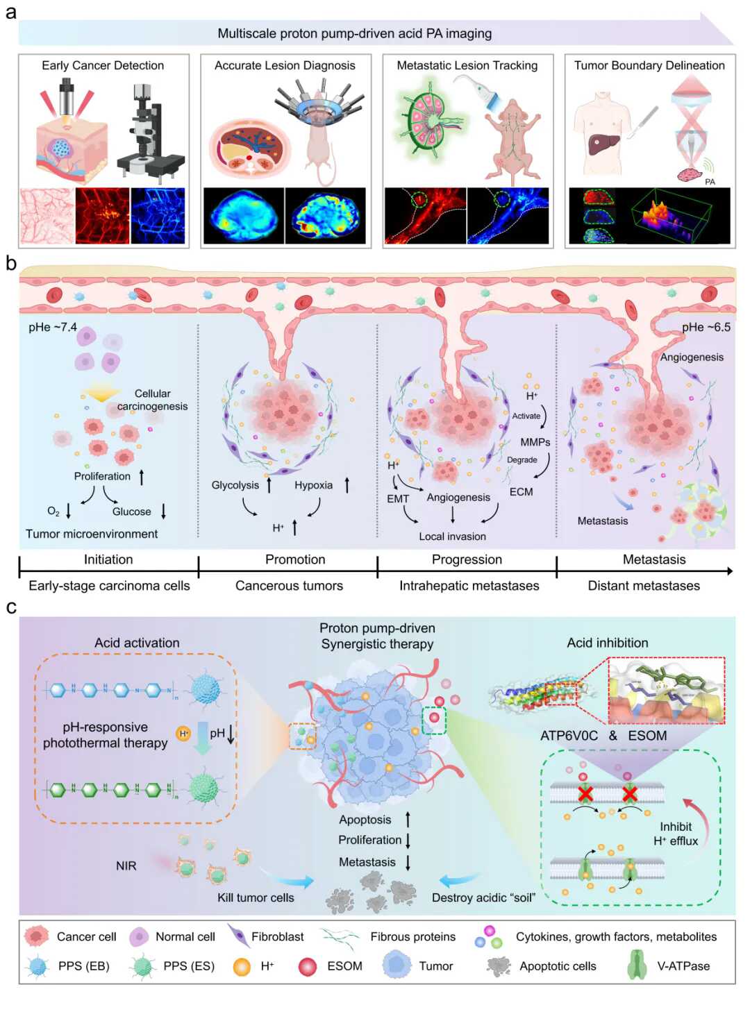 近期,中国科研实验室深圳先进技术研究院医学成像科学与技术系统全国重点实验室刘成波研究员、陈敬钦副研究员联合南方医科大学珠江医院方驰华教授团队顺利获得多尺度光声分子成像结合pH响应比率型分子探针,实现了对肿瘤酸度的实时动态评估,在活体层面实现了从肿瘤早期形成、到肿瘤发生开展、以及晚期肿瘤转移的动态成像,持续定量地监测了肿瘤微环境的时空酸化过程,基于相关技术实现了人体离体肿瘤样本边界成像,研究成果以"Multiscale imaging on proton pump-driven acidity for assessing tumor progression and metastasis"为题发表于Nature Communications。